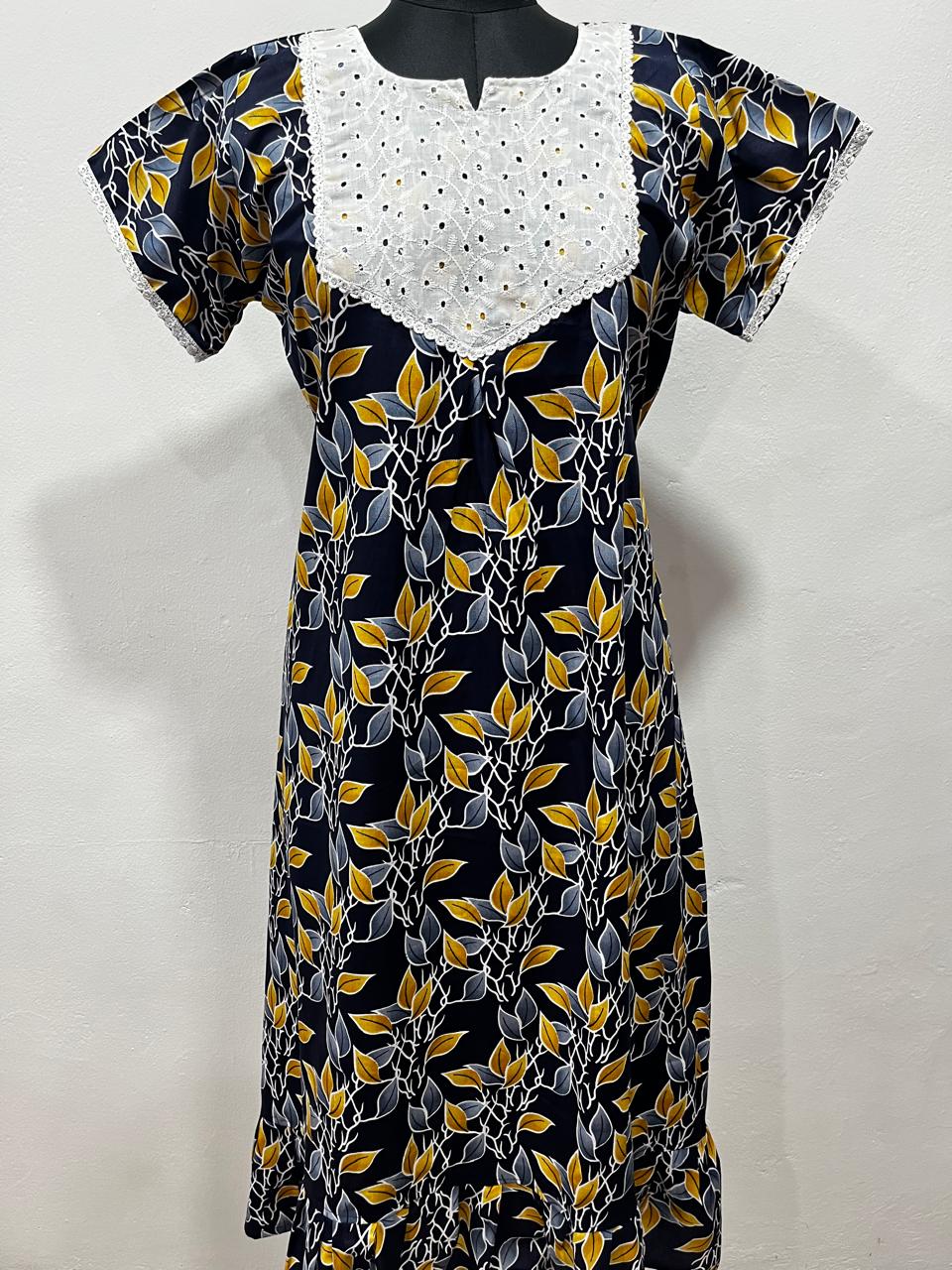 Frock Nighty with Hakoba work Neck – Cotton | Lace-Edged Sleeves (48” Length | 44” Width)