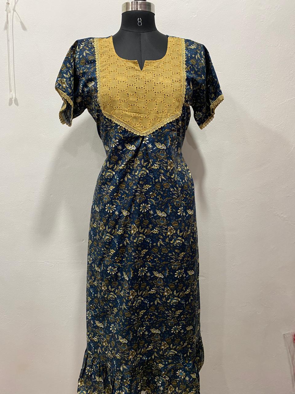 Frock Nighty with Hakoba work Neck – Cotton | Lace-Edged Sleeves (48” Length | 44” Width)