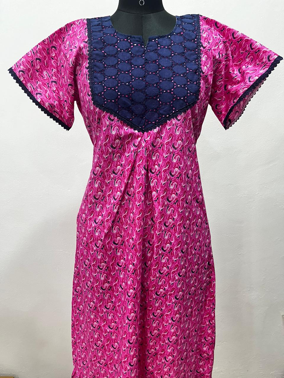 Frock Nighty with Hakoba work Neck – Cotton | Lace-Edged Sleeves (48” Length | 44” Width)